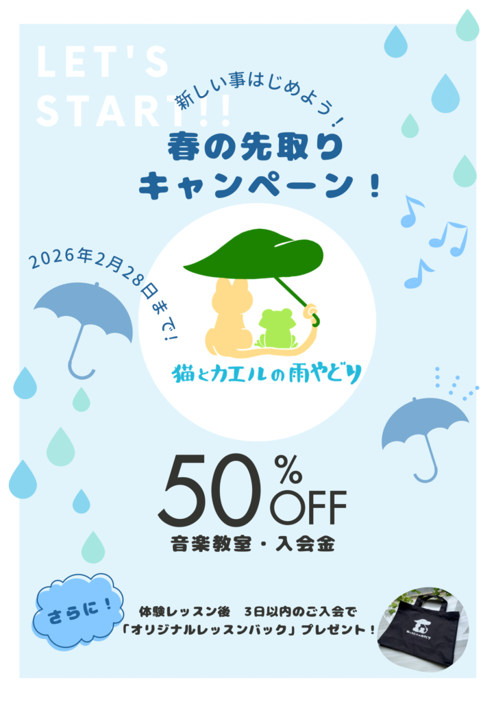 2026年2月1日~2月28日の間に音楽教室にご入会いただいた方には入会金半額です。
